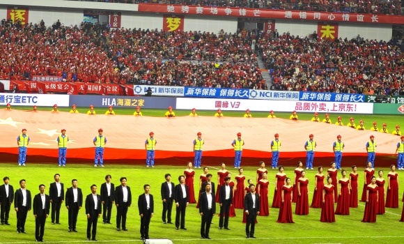 “南通是海內(nèi)外聞名的建筑之鄉(xiāng),累計(jì)榮獲魯班獎(jiǎng)124項(xiàng)。今天,榮獲魯班獎(jiǎng)33項(xiàng),獲獎(jiǎng)數(shù)位列江蘇第一的南通建筑鐵軍王牌——南通四建的年輕項(xiàng)目經(jīng)理、技術(shù)骨干們,和南通職業(yè)大學(xué)建筑工程學(xué)院的未來(lái)建筑師們,一起擔(dān)任國(guó)旗護(hù)旗手,掌聲歡迎他們。”主持人大麥剛剛播報(bào)完畢,全場(chǎng)立即掌聲雷動(dòng)。數(shù)萬(wàn)球迷們齊聲高唱《歌唱祖國(guó)》。這跨越年齡與職業(yè)的合唱,唱出了南通“建筑鐵軍”之鄉(xiāng)的驕傲,也唱出了新時(shí)代青年的擔(dān)當(dāng)。這一刻,整個(gè)體育場(chǎng)為之動(dòng)容??磁_(tái)上的球迷打開手機(jī)的手電筒,跟著旋律輕輕哼唱,3萬(wàn)余人的歌聲交織在一起,成為南通這個(gè)秋夜最動(dòng)人的風(fēng)景。