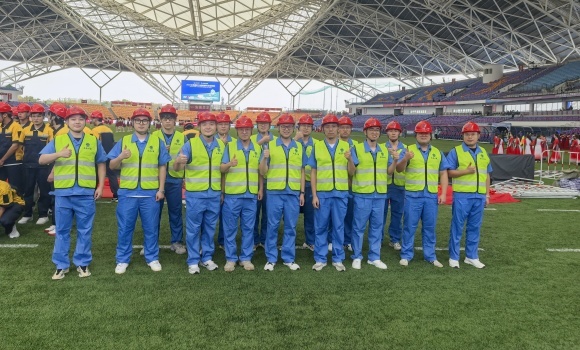令人激動(dòng)的是,在比賽開始前的暖場(chǎng)文藝表演中,來(lái)自南通四建集團(tuán)的15位員工作為巨幅國(guó)旗的護(hù)旗手閃亮登場(chǎng)。他們頭戴紅色安全帽,身著統(tǒng)一淡藍(lán)色工裝和反光背心,步履矯健,英姿煥發(fā),展現(xiàn)出南通建筑鐵軍的良好形象。